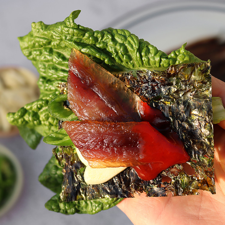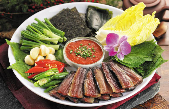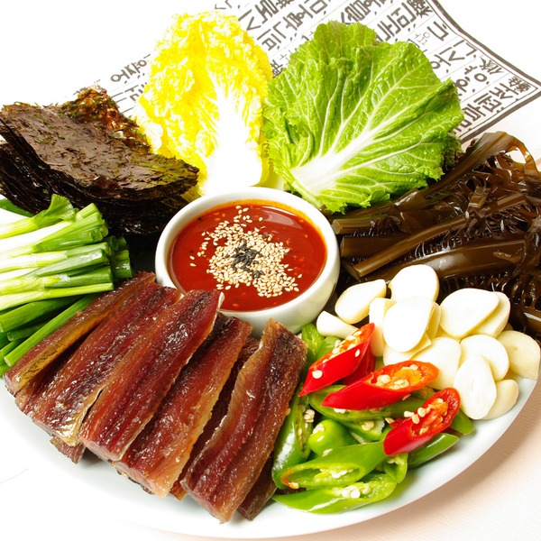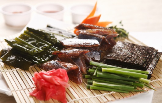 대표적으로 함께 먹는 부재료들을 보면, 다시마, 미역, 고추, 배추쌈, 김, 쪽파, 마늘 등과 함께 먹고