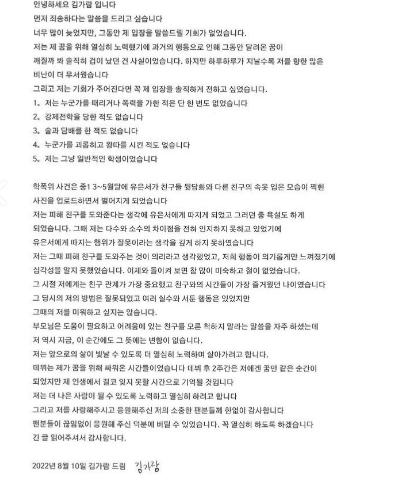 김가람은 "저는 누군가를 때리거나 폭력을 가한 적은 단 한번도 없었습니다. 강제 전학을 당한 적도 없습니다. 술과 담배를 한 적도 없습니다. 누군가를 괴롭히고 왕따를 시킨 적도 없습니다"라고 강조했습니다.
