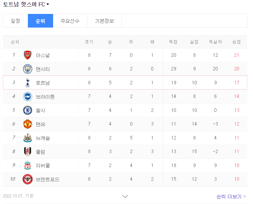현재 2022년 10월 7일 기준 총 8게임을 했고 5승 2무 1패 로 리그 3위 입니다. 아직 초반이기 때문에 순위가 어떻게 바뀔지 예측하기 매우 힘든 상황이네요~