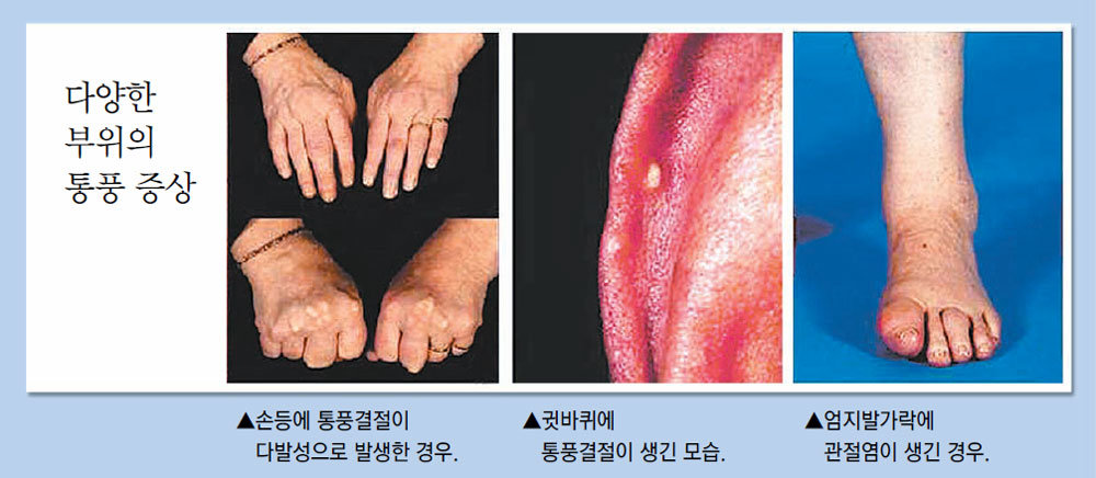 신체가 더 이상 요산을 잘 분해하지 못하며 관절에 쌓여 결정을 형성하는데 주로 발가락에 생깁니다. 이불, 시트 등이 스치는 것조차 불편하고 아픕니다.