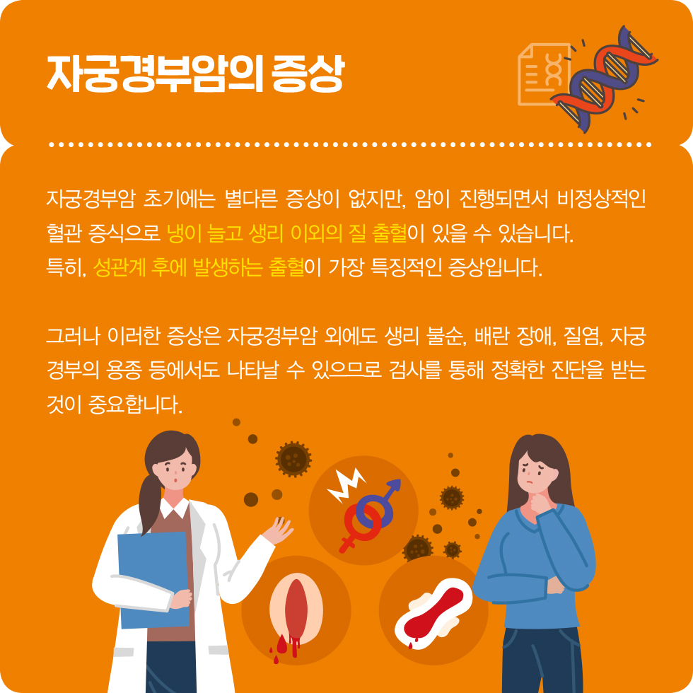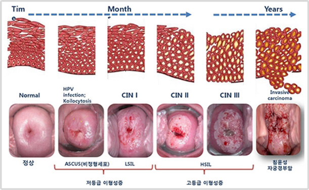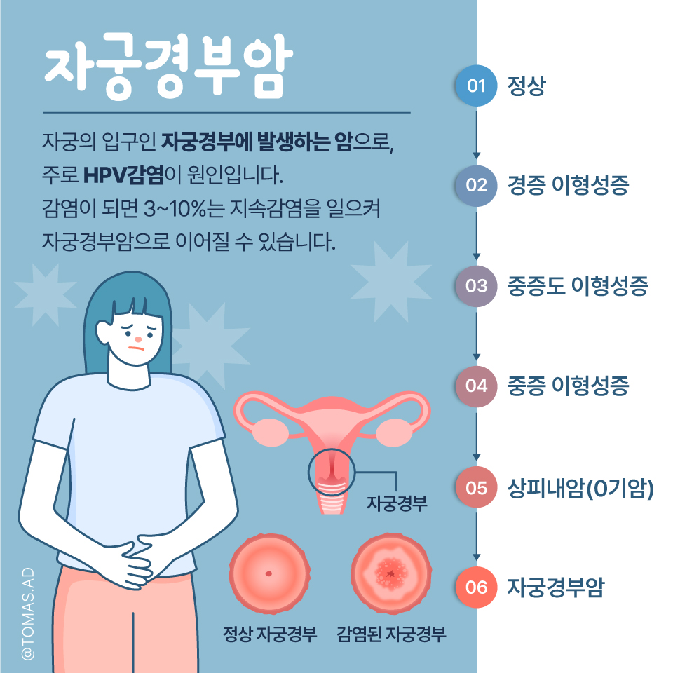 자궁경부암은 감염된 사람과의 성접촉에 의한 HPV(인유두종바이러스) 감염이 주된 원인 인데요. 인유두종 바이러스 감염은 대부분 무증상이고 자연치유가 되지만, 3~10%는 지속적인 감염을 일으켜요. 암을 일으킬 가능성이 높은 HPV 16형, 18형 등의 경우 계속해서 감염될 경우, 수년에서 수십 년 후 자궁경부암으로 진행 할 수 있어요.